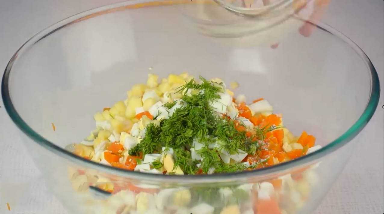 Остальные компоненты салата готовят в соответствии с рецептом. Для заправки используют растительное масло, майонез или другие холодные соусы.