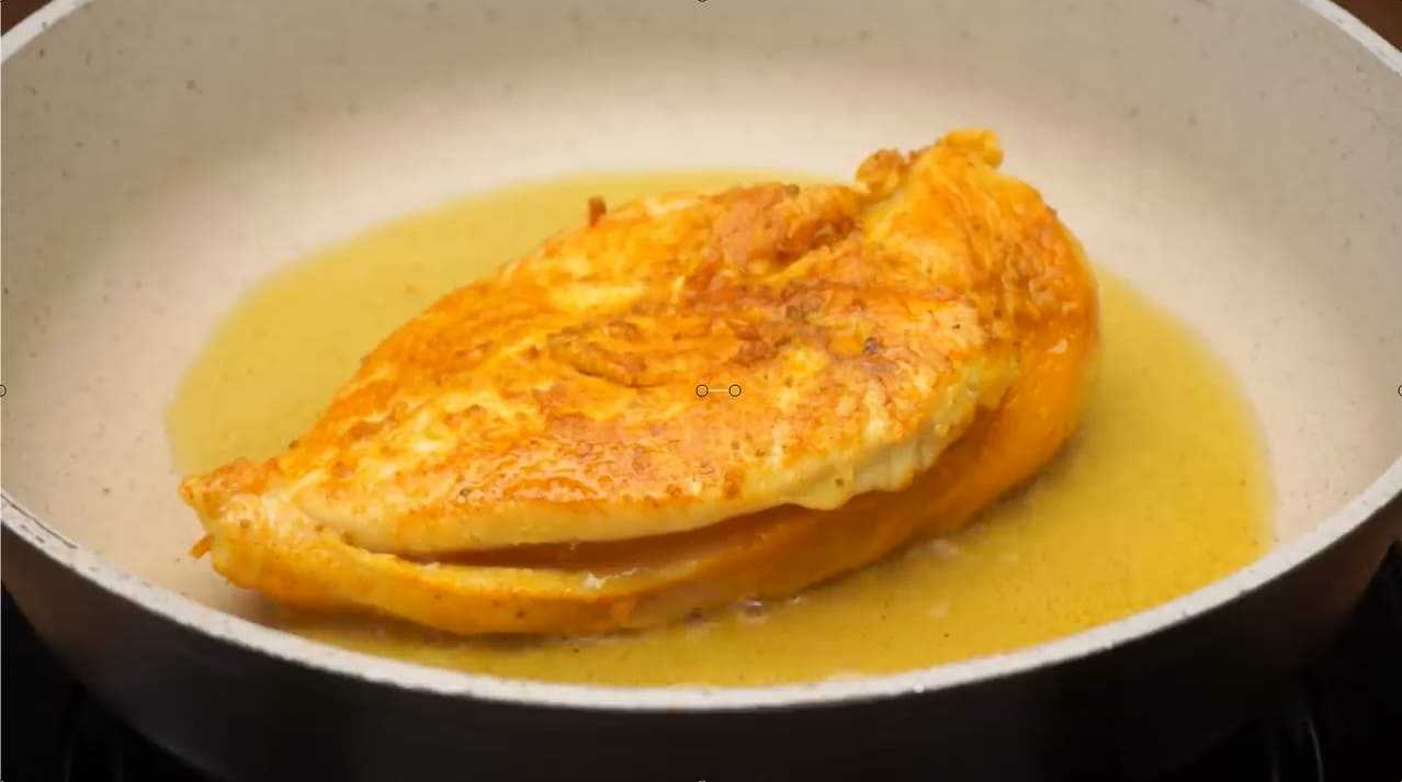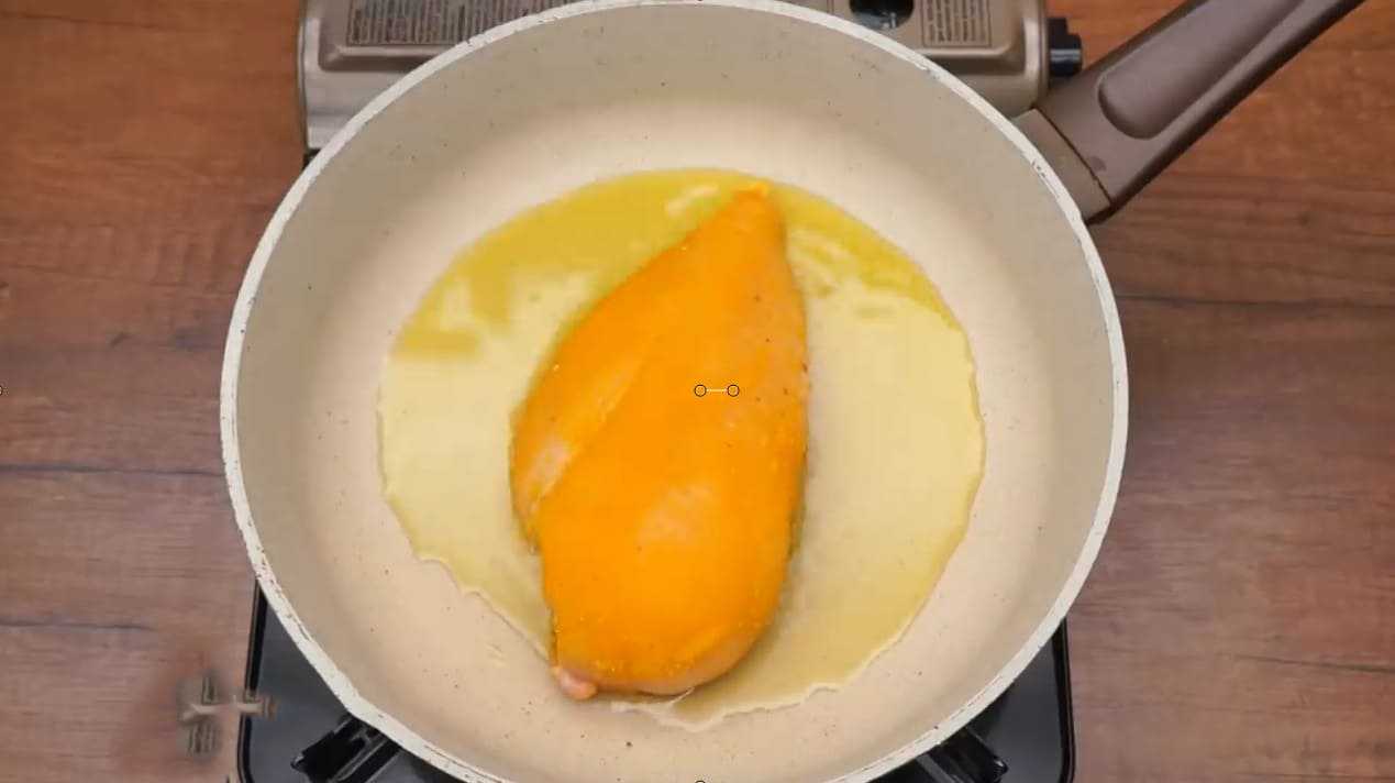 Берем сковородку, капаем немного масла и разогреваем все на плите. Когда поверхность раскалится – аккуратно кладем кусок мяса в сковороду. Куриное филе готовится быстро: по три минуты на каждую из сторон и достаем. Если передержим – появляется риск спалить наш продукт на огне.