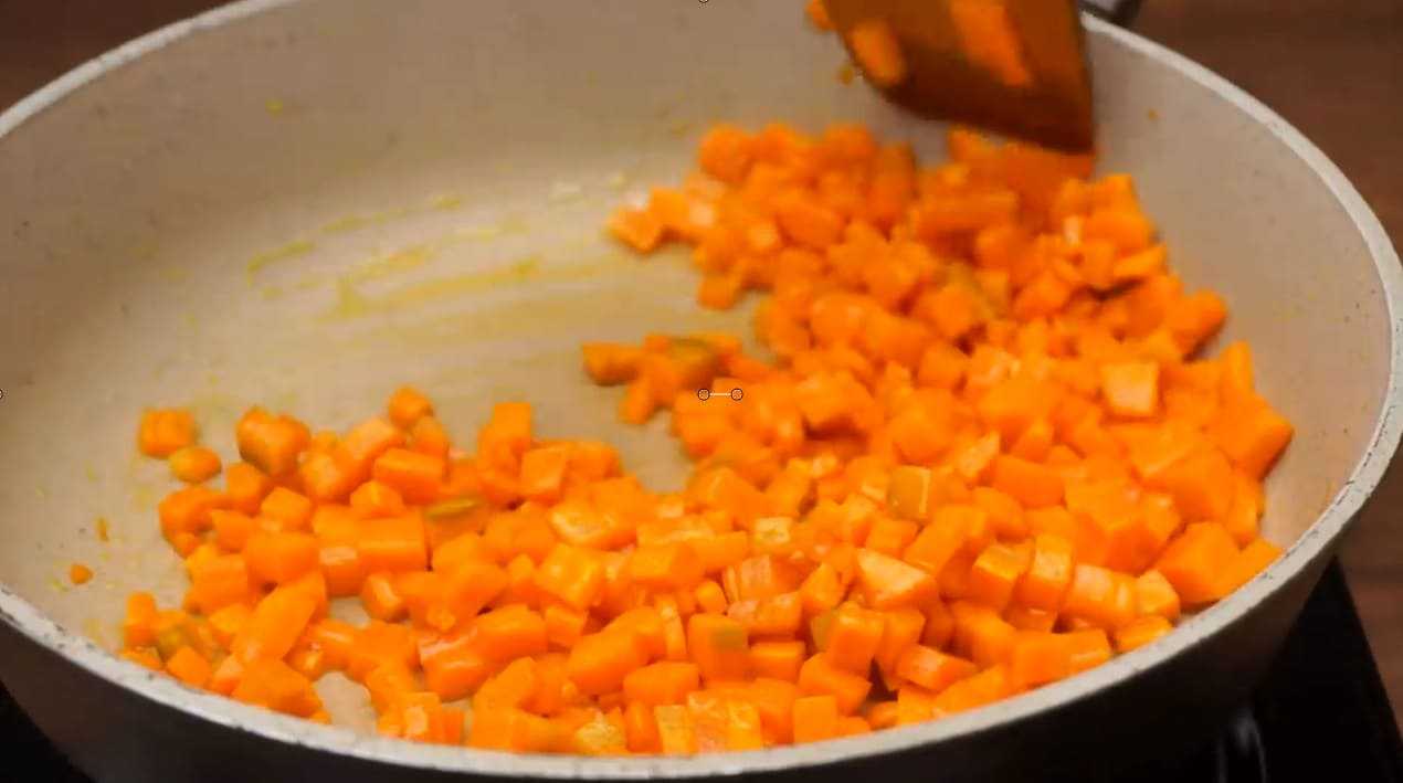Обжарим лук до появления золотинки. Свежую морковку нарежем на те же кубики и аналогично подогреем ее на сковороде.
