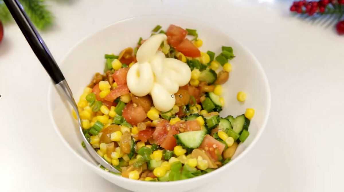 - Соедините все ингредиенты и заправьте салат майонезом. Если нужно, немного посолите.