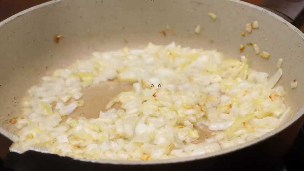Одновременно займитесь овощами. Покрошите луковицу мелким кубиком. Выложите на сковородку обжариваться.