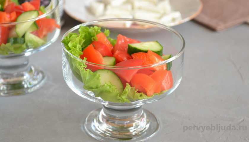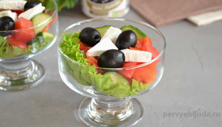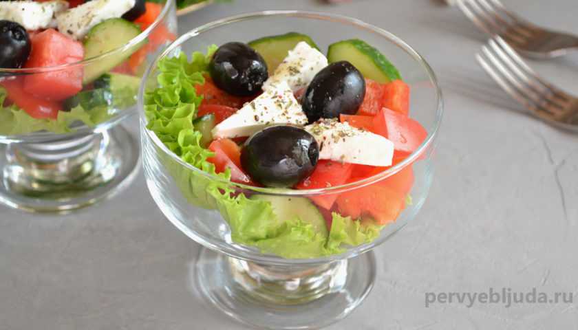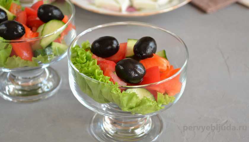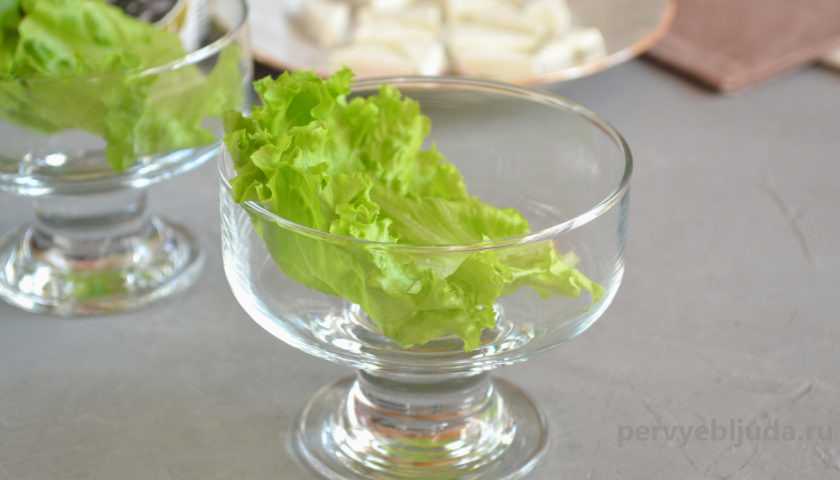 - Блюдо можно подать не только в креманках, но и на одной большой тарелке. Все ингредиенты выкладываем поочередно, поливаем маслом, посыпаем солью, травами, подаем и перемешиваем блюдо на столе. Снизу размещаем листья салата, сверху маслины и кусочки сыра.