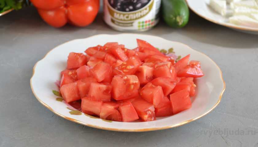 - Помидоры порезать достаточно мелко, а салатные листья разорвать руками. Если используется другая зелень, ее необходимо порубить ножом.