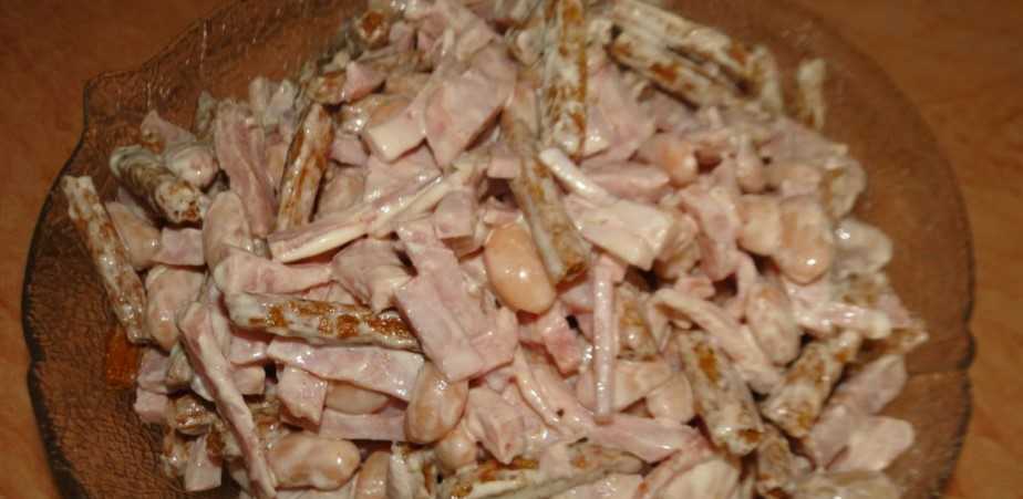 Очень вкусный рецепт с сухариками, фасолью, копченой колбасой и огурцом