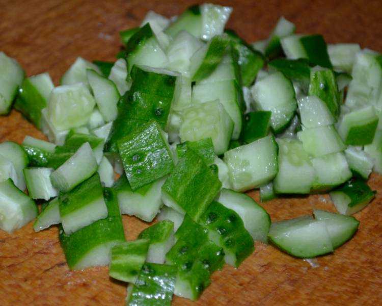 - Огурцы режем небольшими кубиками. Сыр натираем на крупной или средней терке.