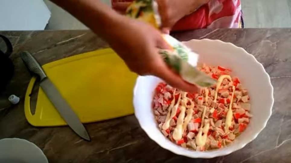 Для удобства я сыр сразу натирала над поверхностью блюда, затем аккуратно придавила руками. Готовый салат уберите в холодильник на полчасика – все ингредиенты должны пропитаться майонезом и схватиться.