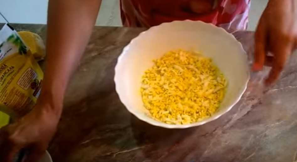 Яйца отвариваем на протяжении десяти минут, остужаем в холодной воде. Чистим и крошим на мелкие квадратики.