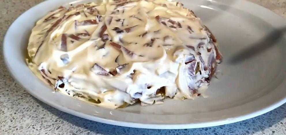 Смазываем их небольшим количеством майонеза. Вообще, в этом салате каждый слой (кроме ананасов, так как они сами по себе достаточно сочные) промазывается этим холодным соусом.
