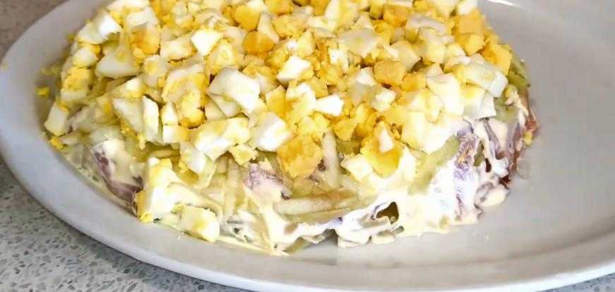Невероятные и насыщенный по составу ингредиентов салат, готов к употреблению. Если он немного постоит в холоде, будет еще вкуснее. Ведь все слои пропитаются ароматной заправкой.