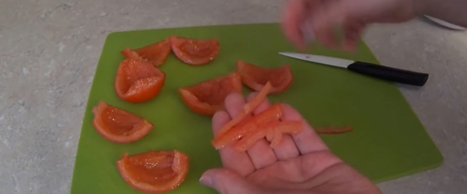 Шаг 2. Помидор разрезать на четвертинки, удалить семена, нарезать мякоть тонкой соломкой, разложить вторым слоем.