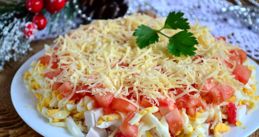 Очень вкусный крабовый салат слоями с помидорами, сыром и яйцами