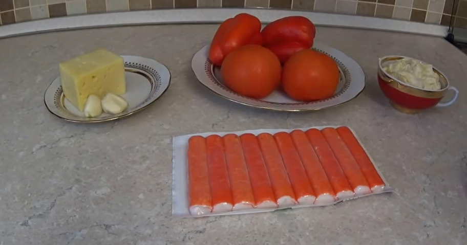 Рецепт 6: слоеный салат с помидорами, чесноком и крабовыми палочками