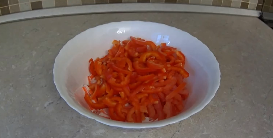 Шаг 5. Красный болгарский перец очистить от семян, разрезать пополам, а потом тонкой соломкой. Сделать завершающий слой салата.