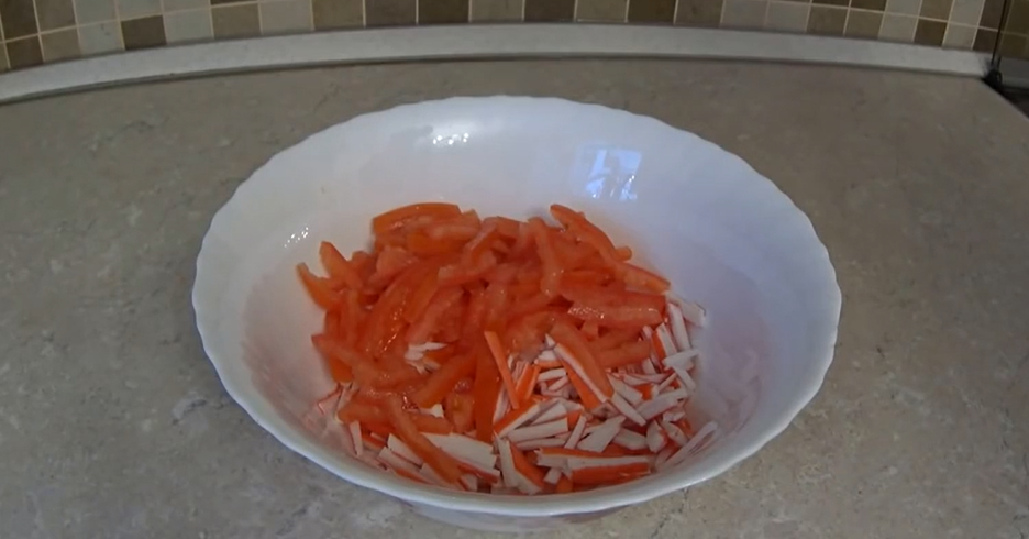 Шаг 1. Нарезать крабовые палочки соломкой. Выложить первым слоем на салатник. Нанести сеточку майонеза.