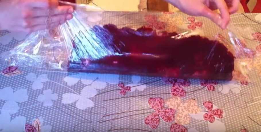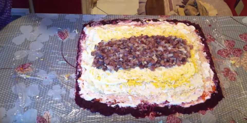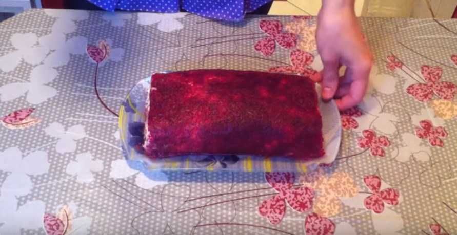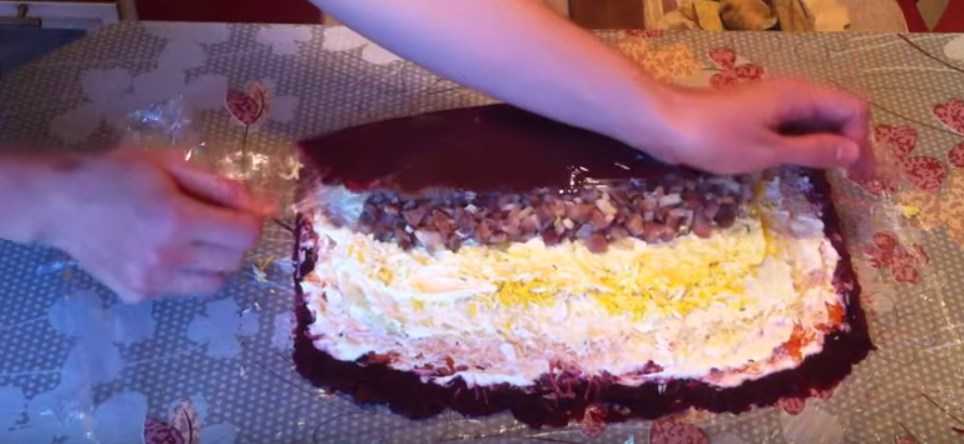 После свеклы каждый последующий слой идет на сантиметр меньше предыдущего, чтобы продукты потом не вываливались их рулета.