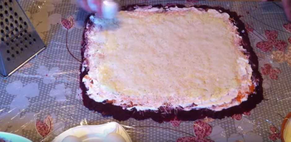 8.Остается закрыть верх свеклой. Натрите ее отдельно на крупную терку. Если она слишком сочная, отожмите, чтобы на блюде не было яркой лужи.