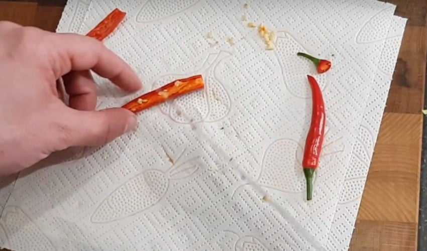 2. Перцы чили разрежьте вдоль, удалите семечки и мелко порубите. Имбирь измельчите, листья каффир-лайма слегка отбейте рукояткой ножа.