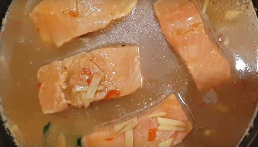 4. Добавьте листья каффир-лайма, имбирь и чили, положите кусочки лосося. Готовьте 8-10 минут на минимальном огне, постоянно поливая рыбу жидкостью.
