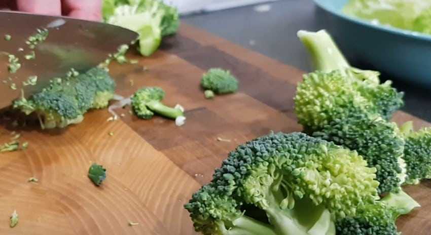 1. Пекинскую капусту разделите на стебель и листья, нарежьте тонкими ломтиками. Брокколи разделите на соцветия и порежьте их.