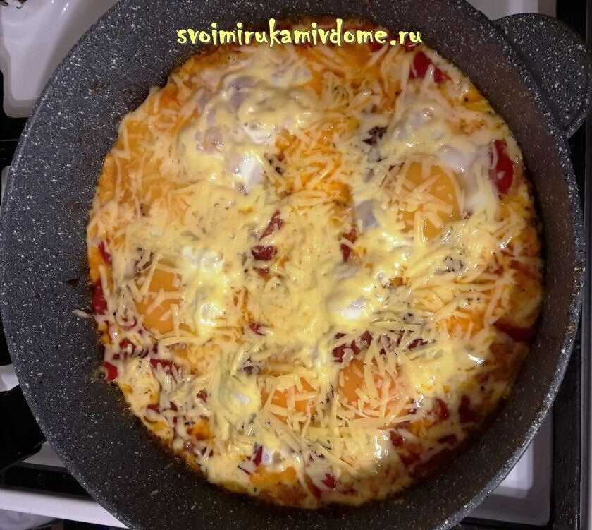Теперь пришло время куриных яиц. Их надо разбить к томатам и обязательно посолить. Сверху выложить натёртый сыр, накрыть крышкой, убавить огонь и готовить до тех пор, пока сыр полностью не расплавится.