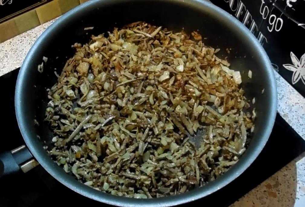 Нарубить луковицу тонкими полукольцами, а затем, кубиками. Обжарить в горячем растительном масле до румяной корочки.