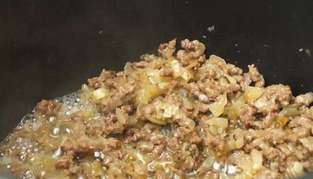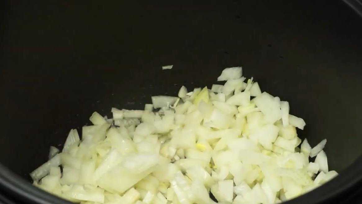 - Почистите луковицу и помойте. Нарежьте мелко, обжарьте в мультиварке на режиме «Жарка» в течение 4-5 минут. Добавьте туда же говяжий фарш. И обжаривайте на том же режиме еще 7-10 минут, перемешивая. Посолите.