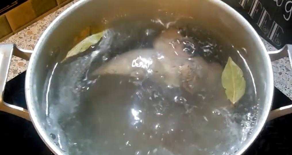 Поместить печень в холодную воду на 60 минут. В кипяток добавить лавровый лист, всыпать половину соли. Отварить в нем свиную печень в течение 20 минут.