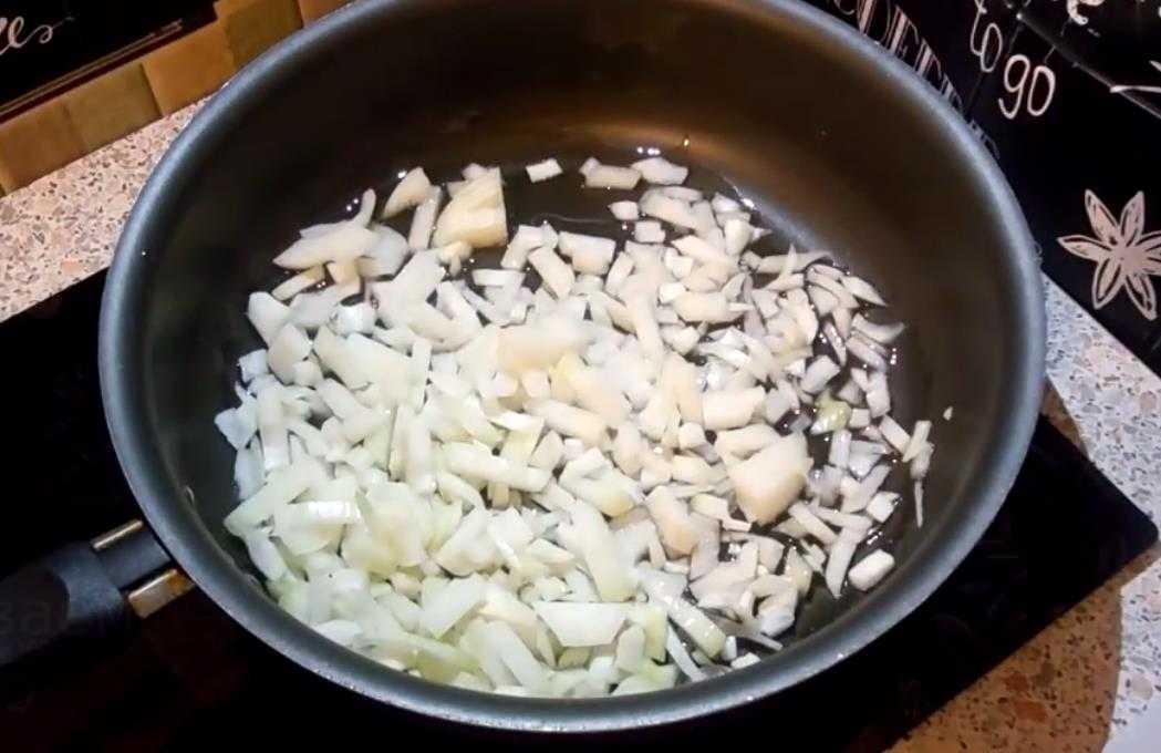 1. Берем две средних луковицы или одну большую и нарезаем на кубики. Заливаем растительное масло в большую сковородку. Если она с антипригарным покрытием, то масла поменьше. Всыпаем лук и обжариваем до беловато-золотистого цвета. Помешиваем для равномерной обжарки.