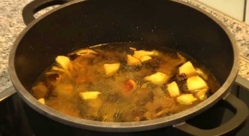 - Тщательно почистить грибы, помыть, залить водой и поставить вариться на четверть часа. Готовые грибы вынуть из воды шумовкой и остудить. Нарезать их небольшими ломтиками. Бульон оставить, он пригодится нам чуть позже.