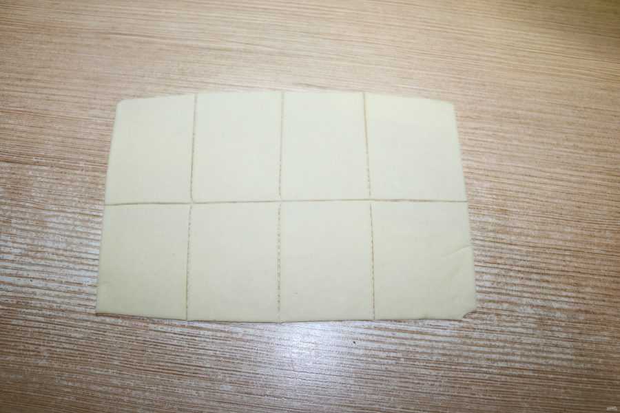 Тесту дайте отдохнуть, накройте кухонным полотенцем. Затем раскатайте и нарежьте на квадраты.