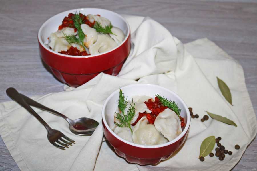 - Приготовить пельмени обычным методом: отваривая в воде или готовом бульоне. Необходимо выбрать глубокую посуду и выкладывать на ее дно получившийся соус, сверху — чучвару, а потом залить получившееся бульоном и посыпать зеленью.