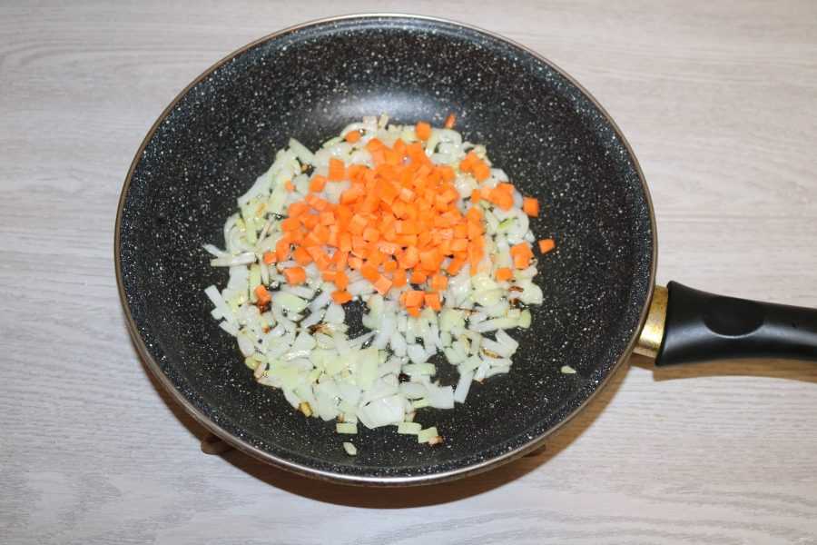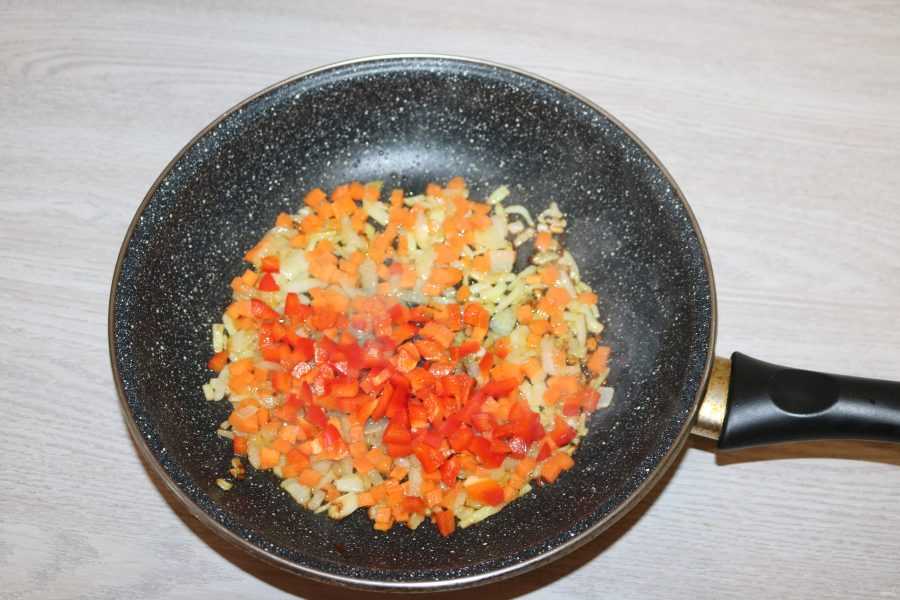 - Нагреть сковороду, налить масла. Добавить морковь, лук, а последним — перец.
