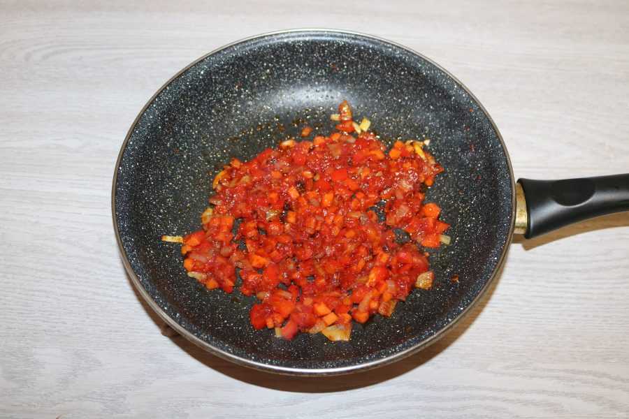 Затем добавьте нарезанный кубиками перец. Обжаривайте всё вместе 1-2 минуты.