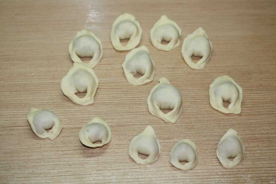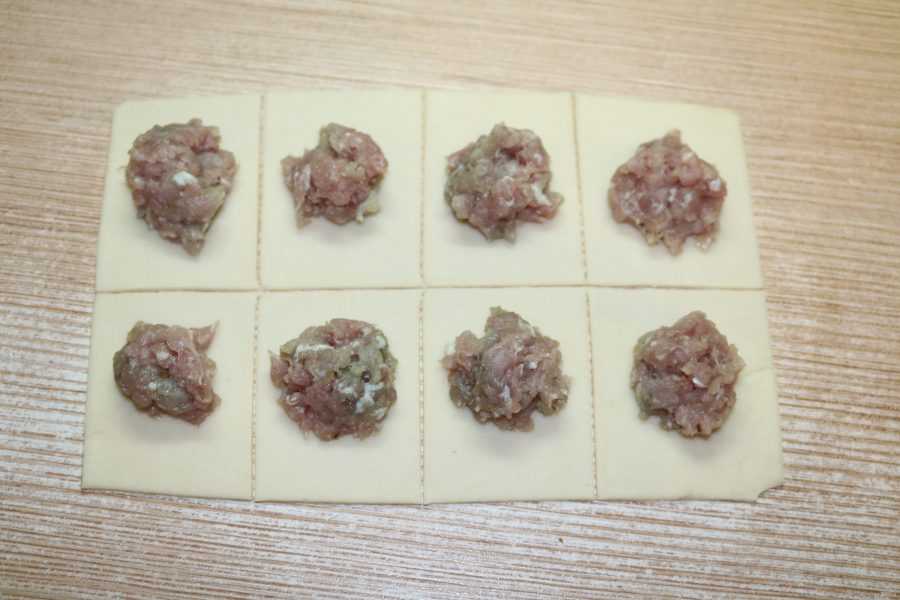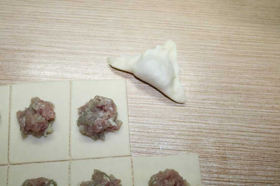 После того как тесто будет подготовлено, на каждую заготовку выкладывают небольшой комочек мясной начинки. Далее основу перегибают и лепят из нее своеобразный треугольничек. В дальнейшем его края крепко соединяют по принципу приготовления пельменей.