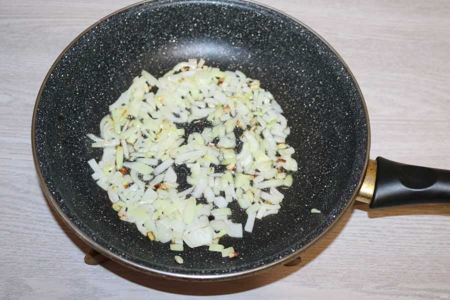 Лук нарежьте мелким кубиком, обжарьте в небольшом количестве подсолнечного масла до золотистого цвета.