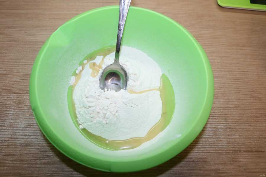 - Сначала следует заняться приготовлением теста. В миску нужно влить 300 мл воды, разбить в неё 2 яйца и всыпать 1 ч. л. поваренной соли. Компоненты нужно взбить вилкой до образования однородности. Теперь нужно просеять муку в жидкость, постоянно перемешивая компоненты вилкой. Когда тесто станет довольно плотным, в него следует влить 3 ст. л. масла и замесить тесто руками. Готовое тесто не должно липнуть к рукам, его следует завернуть в пищевую пленку и убрать в холодильную камеру на 30 – 40 мин.