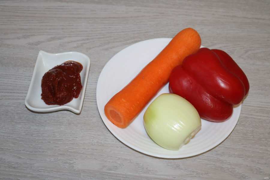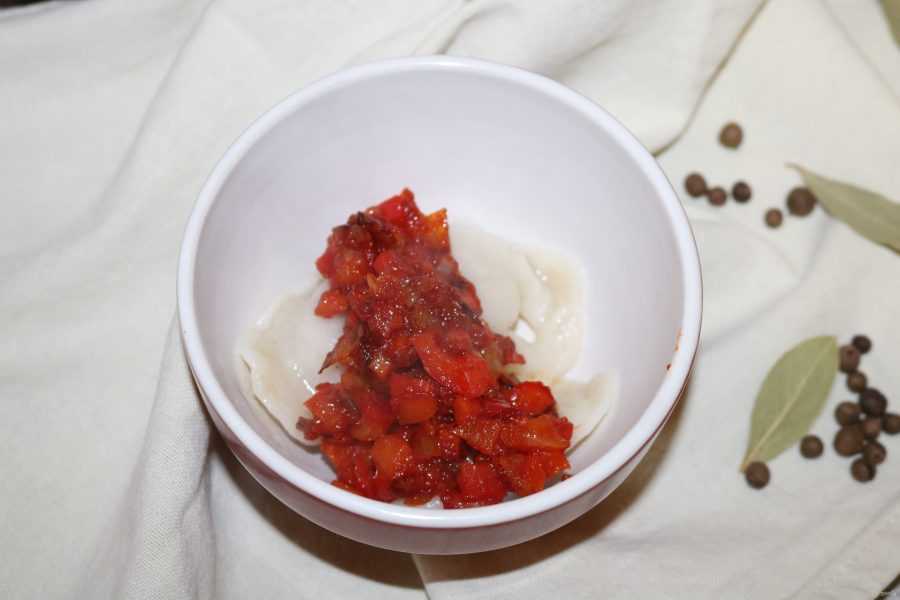 - После приготовления пельменей необходимо приступить к готовке соуса. Для него необходимо нарезать лук, морковь и перец небольшими кубами.